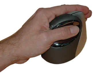 3M - Maus Das ergonomische Design hält den Arm in einer natürlichen Position, wobei durch die vertikale Haltung der Hand der Druck vom mittleren Nerv des Handgelenks genommen wird. Dadurch reduziert sich die Belastung von kleinen Muskeln in der Hand drastisch. Größere Muskelgruppen des Armes übernehmen nun diese Arbeit. Geklickt wird mit dem Daumen, was den sonst immer gebrauchten Zeigefinger entlastet. |