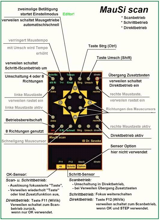 Kommunikationsgeräten steht auch eine Version von MauSi scann im Querformat (M5-17030) zur Verfügung. Die notwendigen Maus- und Tastaturfunktionen und verschiedene Einstellfunktionen aktiviert man über "Tasten", die in einem selbsttätigen Durchlauf (Automatikscann) oder durch den Nutzer mit dem Schritt-Sensor gesteuert (Schrittscann) aufleuchten und dann mit dem OK-Sensor jeweils bestätigt werden.